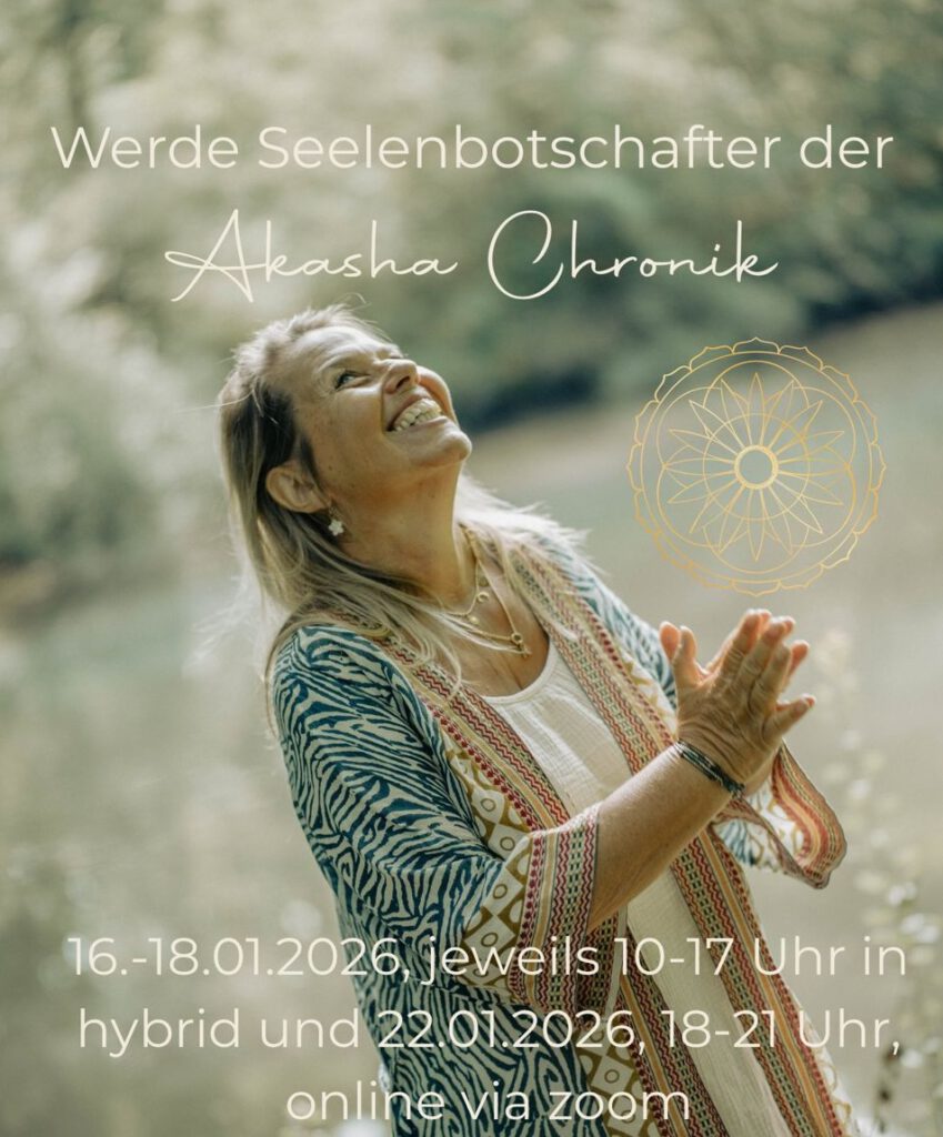 im Januar 2026 gibt es wieder die Möglichkeit, die Verbindung zur Akasha Chronik, zu erlernen und als Seelenbotschafter der Akasha Chronik dir selbst und der Welt zu dienen. Und ja, diese Befähigung ist einzigartig und ganz besonders. Und ja, sie wird dein Ego herausfordern und zum Rebellieren bringen. Gut so. Denn ja, sie wird dich auch wachsen lassen, reifen lassen, authentisch werden lassen. Und ein tiefes Gefühl des Friedens und der Freude, in dir zum Erblühen bringen.